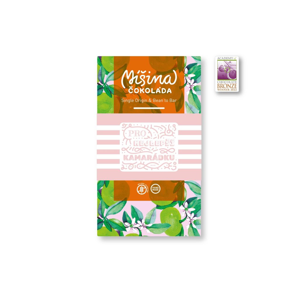 Složení: kakaové boby, kakaové máslo, sušené mléko, třtinový cukr, bio olej ze zelených mandarinek.