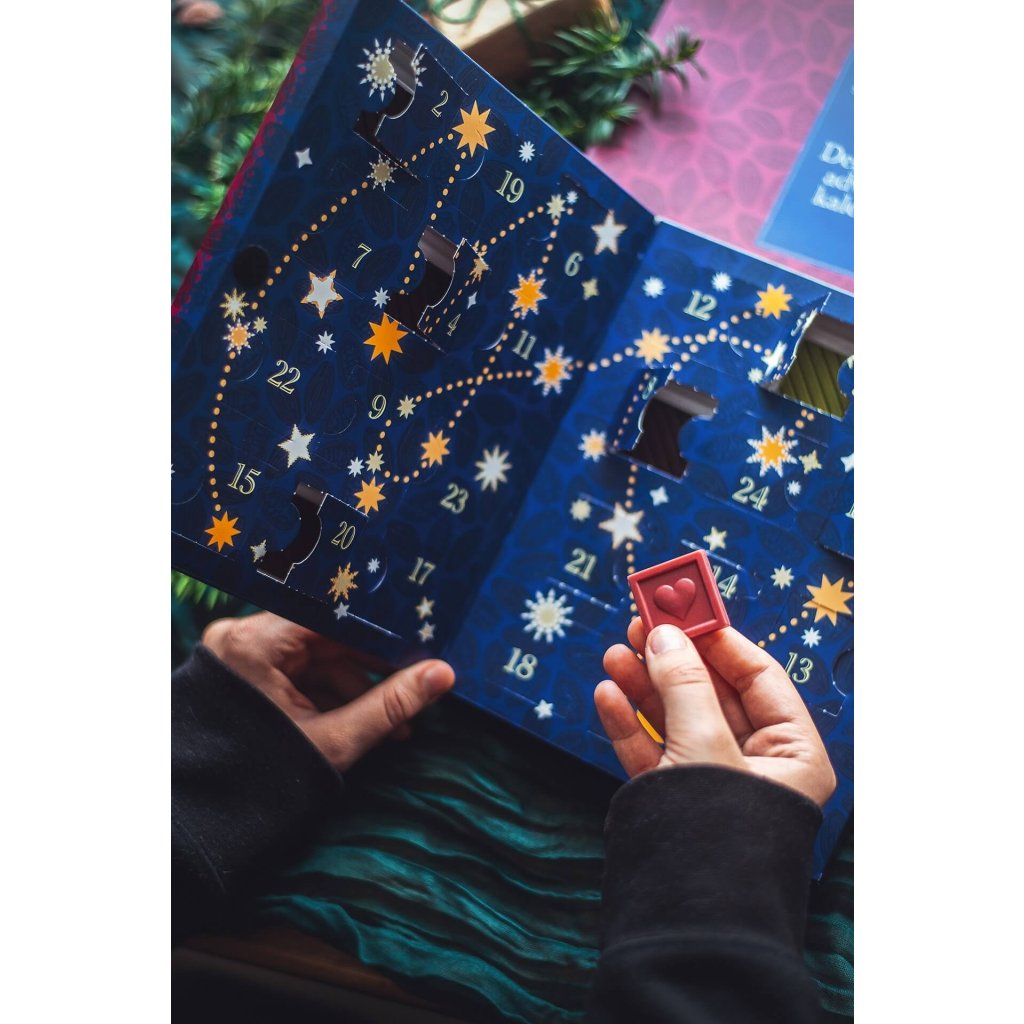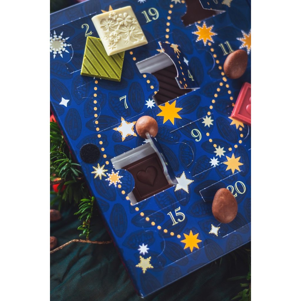 V našem degustačním kalendáři najdete každý den jinou čokoládu - bílou, mléčnou i tmavou (hořkou). A k tomu ještě ořechy obalené v naší čokoládě a pralinku. Každý den budete mít jiný zážitek a je na vás, jestli se podíváte dopředu, jaká čokoláda vás čeká nebo jestli budete ochutnávat naslepo. Na přiloženém letáčku si najdete čísla okének a druhy čokolád. A také postup, jak si čokoládu nejlépe vychutnáte jako profík!
