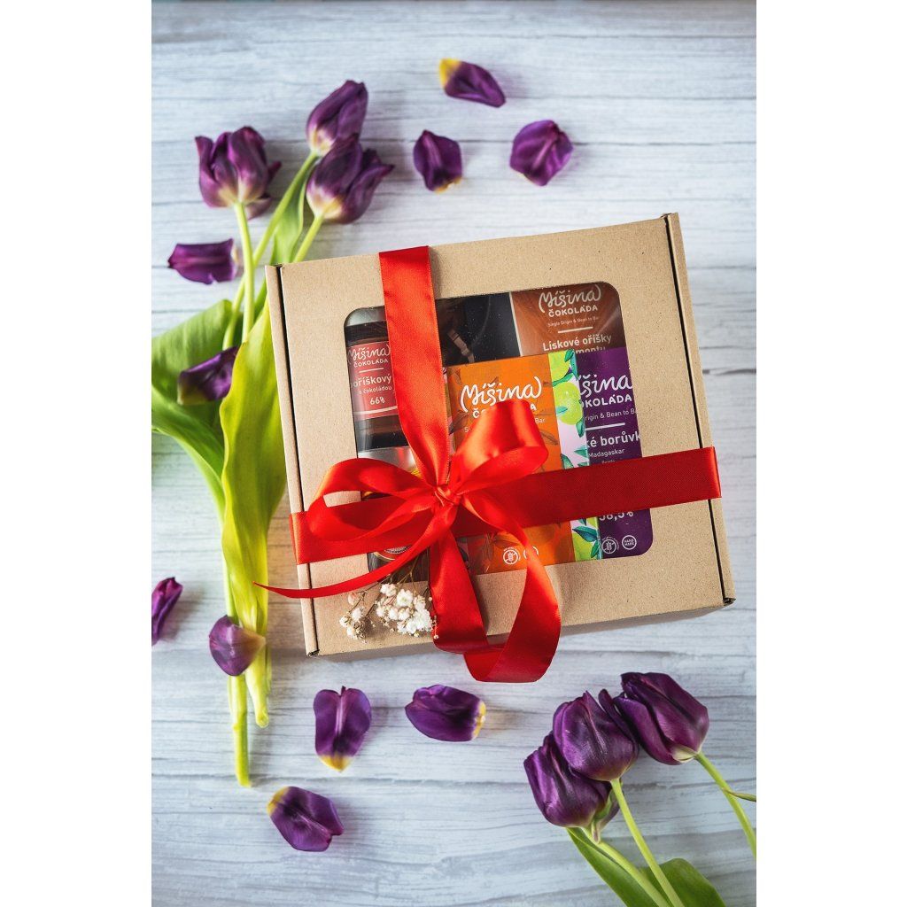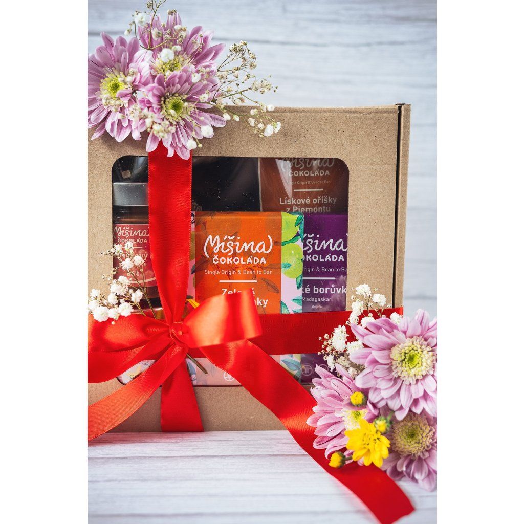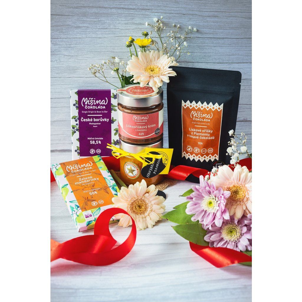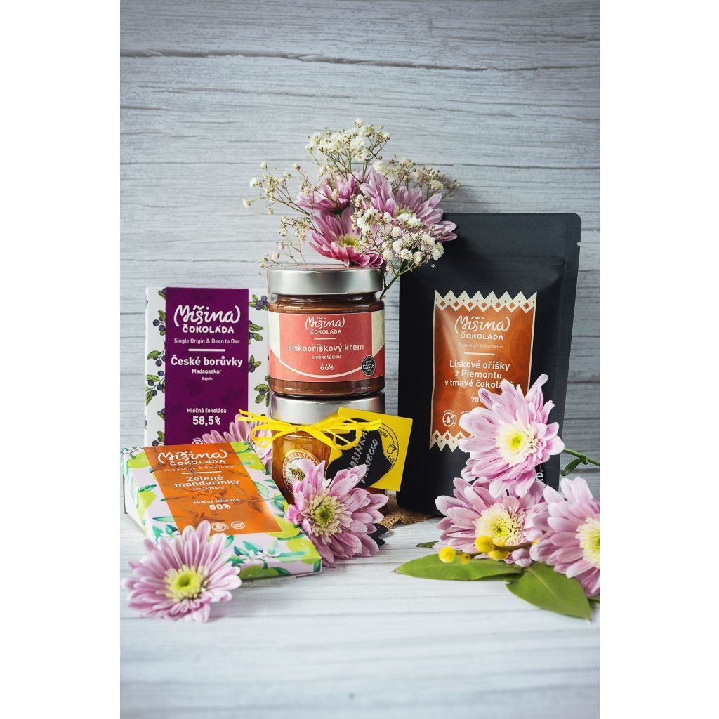 Ingredients: Milk chocolate with Czech blueberries, milk chocolate with green tangerines, hazelnuts in dark chocolate 70%, hazelnut cream Šalamounka, blueberry/tangerine/plum jam.