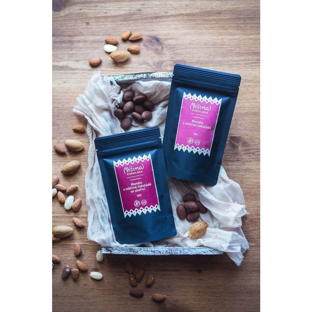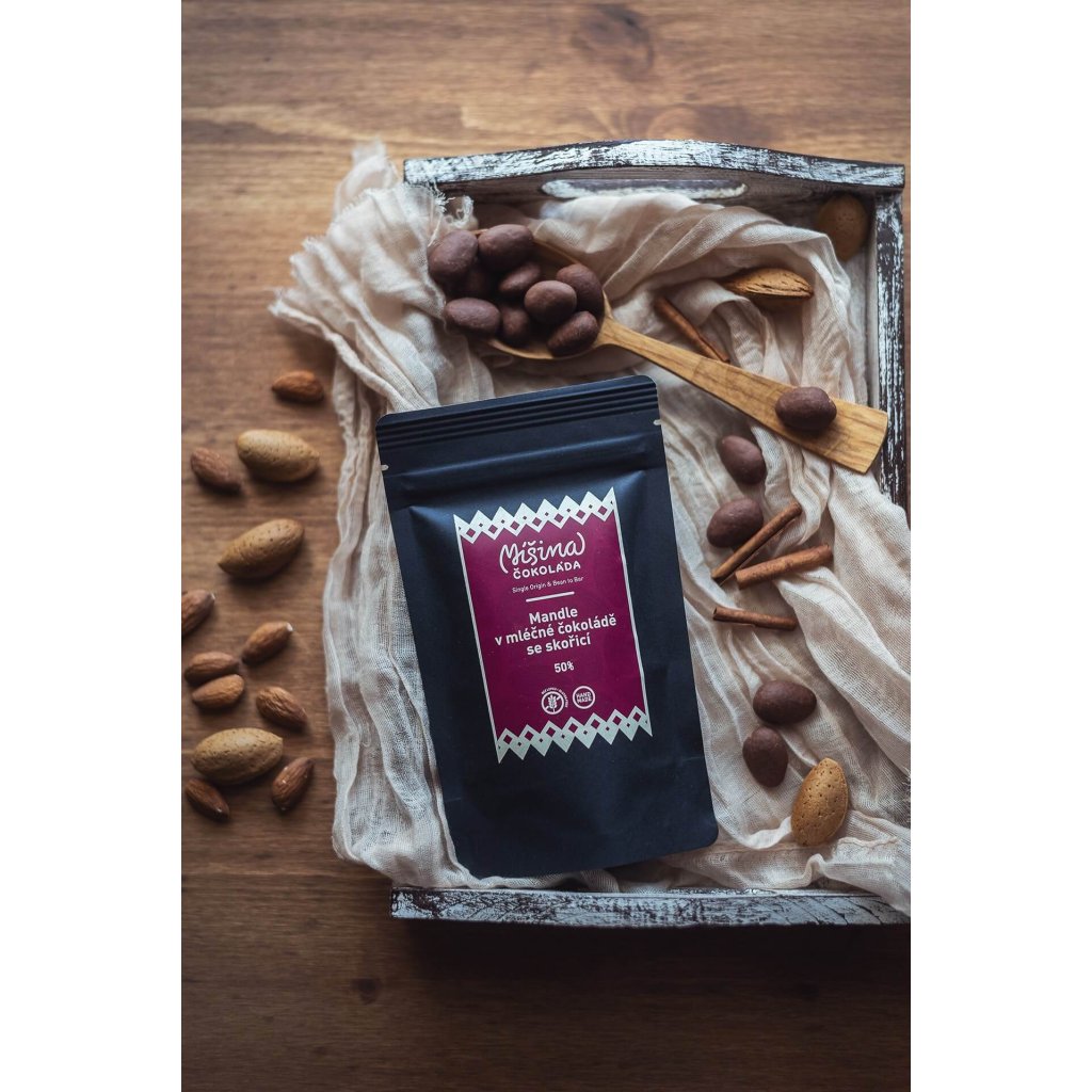 Složení: mandle, kakaové boby, kakaové máslo, třtinový cukr, sušené mléko, skořice.